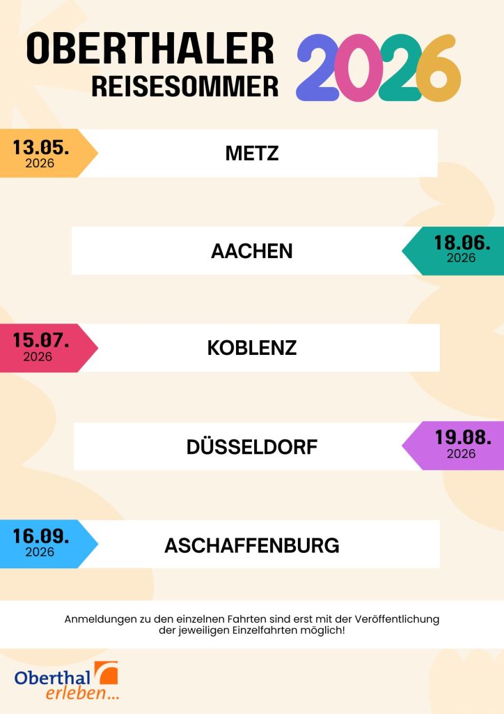 Der beliebte Oberthaler Reisesommer bietet auch 2026 wieder interessante Tagesfahrten zu sehenswerten Städten in Deutschland und im benachbarten Ausland. Die Fahrten richten sich an alle Bürgerinnen und Bürger, die in angenehmer Gemeinschaft Kultur, Geschichte und Freizeit genießen möchten.