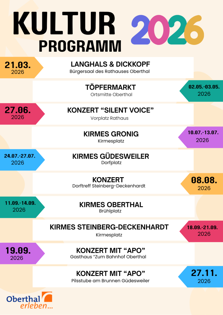 Das Kulturprogramm 2026 wurde in enger Zusammenarbeit mit dem Verein „Freundeskreis Kultur in Oberthal e.V.“ erarbeitet. Die Gemeinde Oberthal bedankt sich herzlich für das große Engagement und die wertvolle Unterstützung bei der kulturellen Gestaltung des Gemeindelebens.