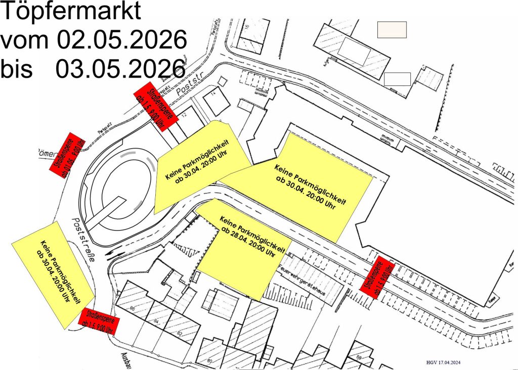 Karte, in der die Parkverbote während des Töpfermarktes eingezeichnet sind.