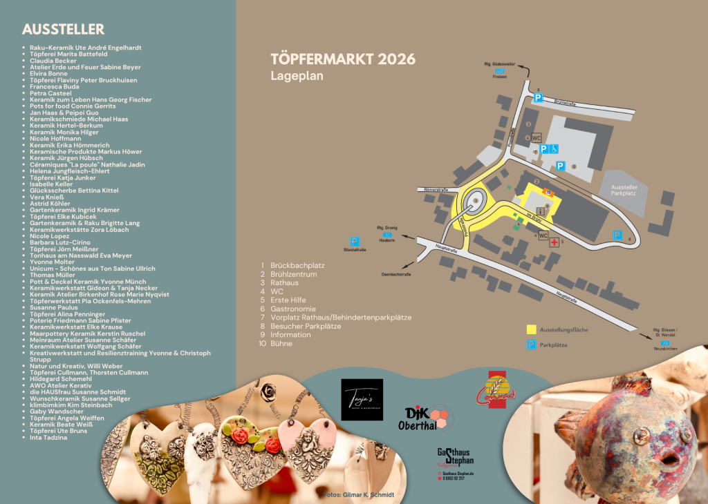 Auflistung der Aussteller des Oberthaler Töpfermarktes: Nachname Vorname Firma André Engelhardt Ute Raku-Keramik Battefeld Marita Töpferei Beyer Sabine Atelier Erde und Feuer Bonne Elvira Bruns Ute Töpferei Buda Francesca Finsterer Monika Fischer Hans-Georg Keramik zum Leben Gerrits Connie Pots for food Goertz Bastian Haas Jan Alexander Keramik-Meister Hass Michael Keramikschmiede Hertel-Berkum Erika und Gerd Keramik Hömmerich Erika Keramik Höwer Markus Keramische Produkte Hübsch Jürgen Keramik Jungfleisch-Ehlert Helena Junker Katja Töpferei Keller Isabelle Kerscher Adelinde Werkstatt Züntersbach Kittel Bettina Glücksscherbe Knieß Vera Köhler Astrid Krämer Ingrid Gartenkeramik Kubicek Rossenbach Elke Töpferei Lang Brigitte Gartenkeramik & Raku Löbach Zora Keramikwerkstätte Lopez Nicole Meißner Jörn Töpferei Meyer Eva Tonhaus am Nasswald Münch Yvonne Pott & Deckel Keramik Ockenfels-Mehren Pia Töpferwerkstatt Penninger Alina Töpferei Pfister Sabine Poterie Friedmann Rackelmann Brigitte Förderwerkstatt Atelier Kerativ (AWO) Radzina Inta Ries Dörthe Dörthe Ries Keramik Roder Roswitha R & R Keramik Ruschel Kerstin Maarpottery Keramik Schäfer Wolfgang Keramikwerkstatt Schemehl Hildegard Schuster Dominique Atelier de Céramique Serifoglu Senay Homespunceramic Strupp Yvonne & Christoph Kreativwerkstatt und Resilienztraining Ullrich Sabine Unicum - Schönes aus Ton Wandscher Gaby Weber Willi Natur und kreativ Weigenand Dorothea Töpferei Weiß Beate Keramik Lageplan und Bilder/Impressionen aus den vergangenen Jahren, Logo der Bäckerei Conrad, des DJK Oberthal, des Gasthauses Stephan und von Tanja`s Weinstübchen
